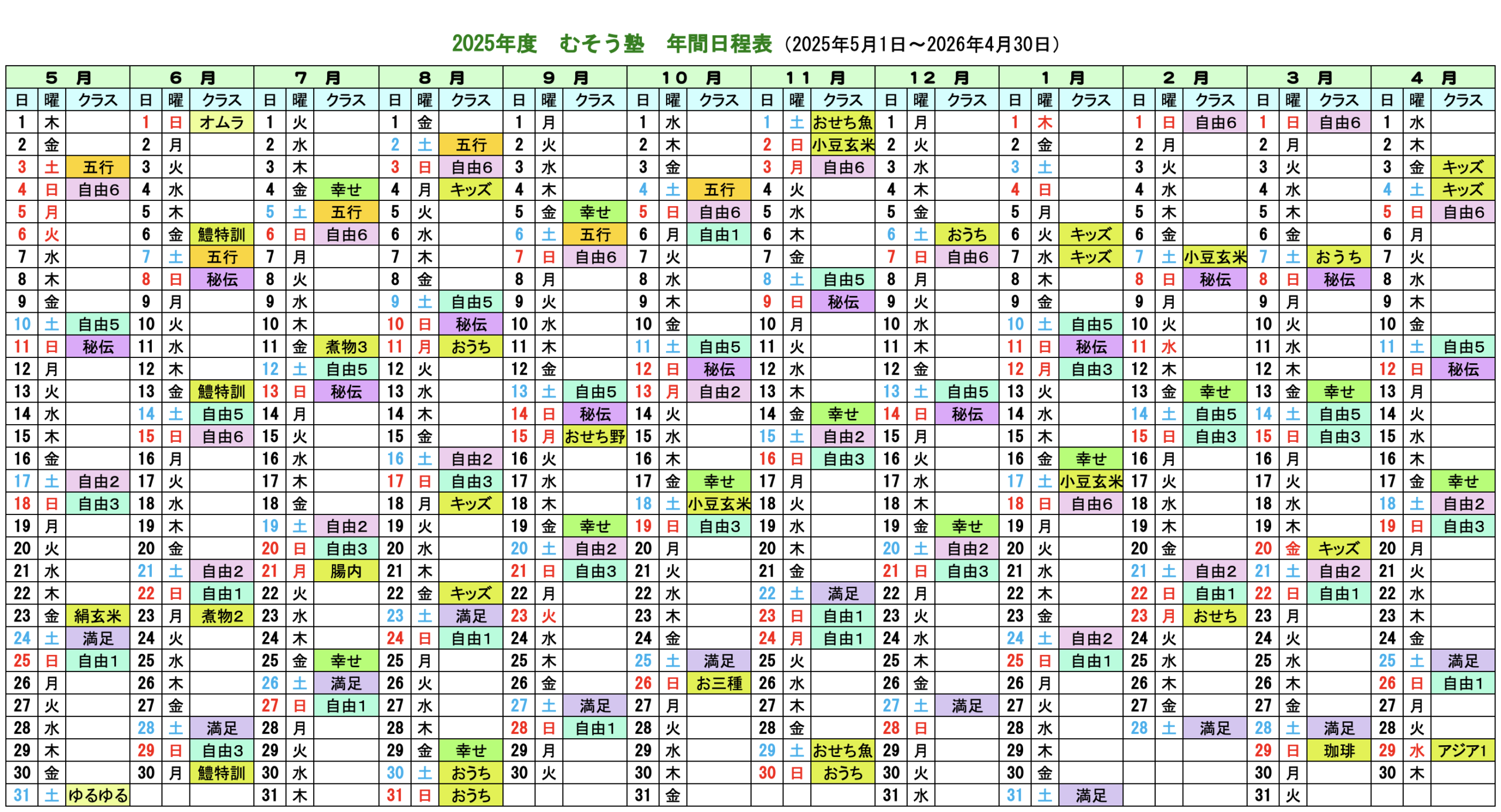 【2025年度 マクロビオティック京料理教室 むそう塾 年間日程表 2025/5〜2026/4】