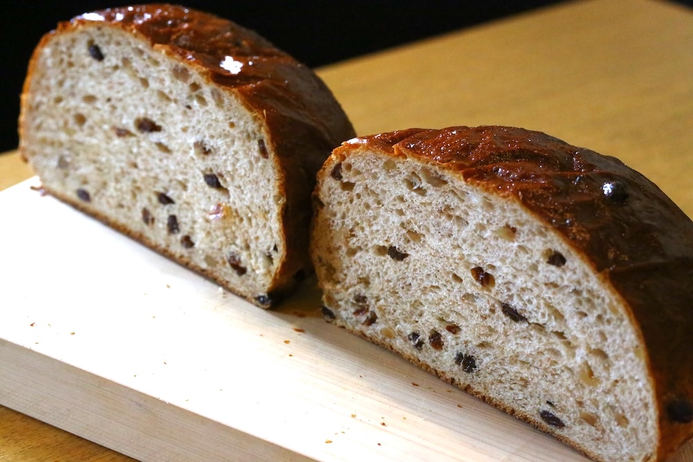 それで、あれこれ考えた結果、「自由人コース2」で教えている「全粒粉胡桃レーズンパン」はどうだろうと思い、中川さんにお願いして焼いてもらいました。