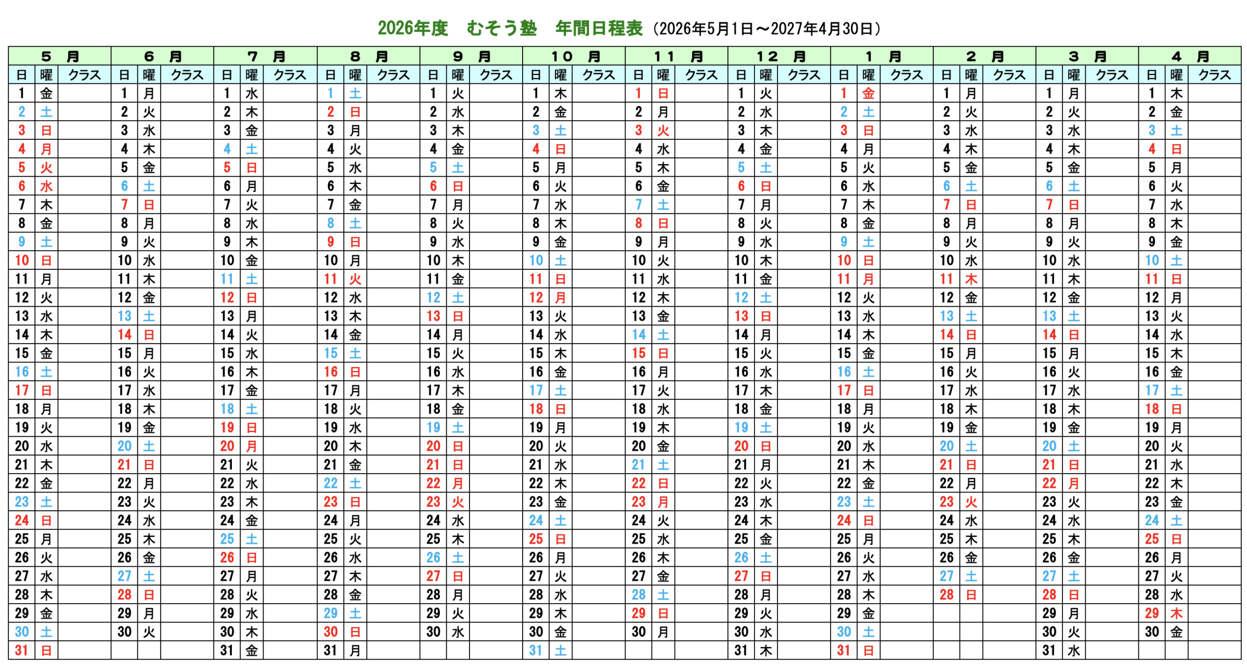【2026年度 むそう塾 年間日程編成のためのカレンダー】