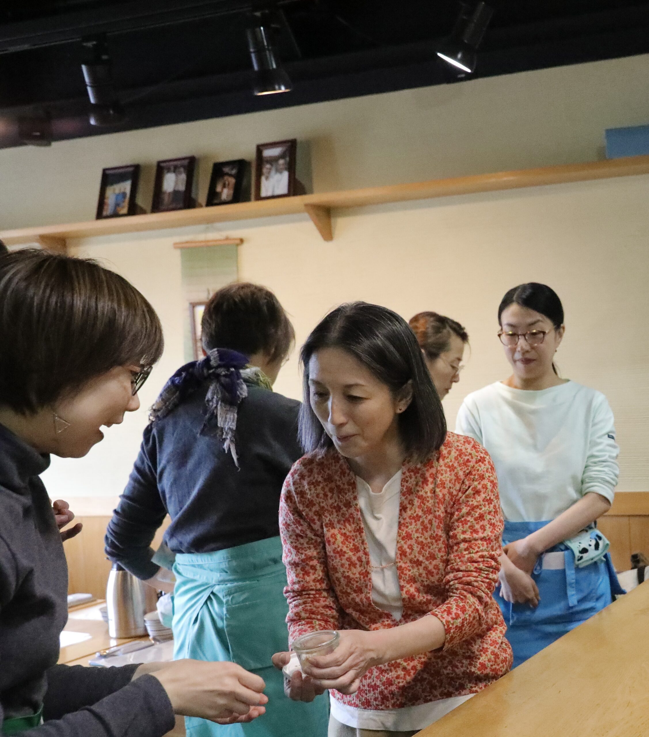 (糠味噌を持参された塾生さん(真ん中)と糠味噌の味見をさせてもらう塾生さん マクロビオティック京料理教室むそう塾)