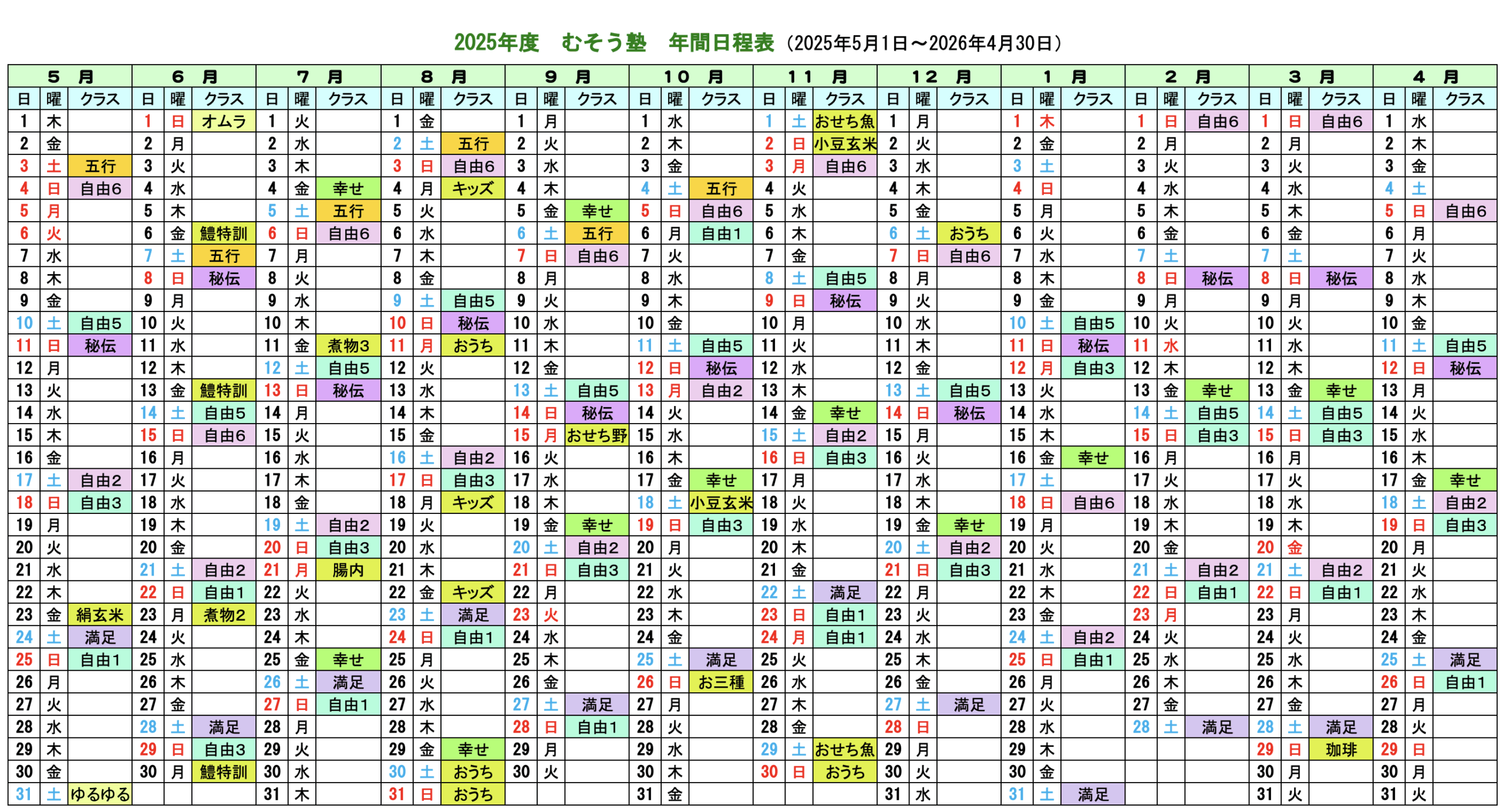 2025年度 マクロビオティック京料理教室 むそう塾 年間日程表 2025/5〜2026/4】