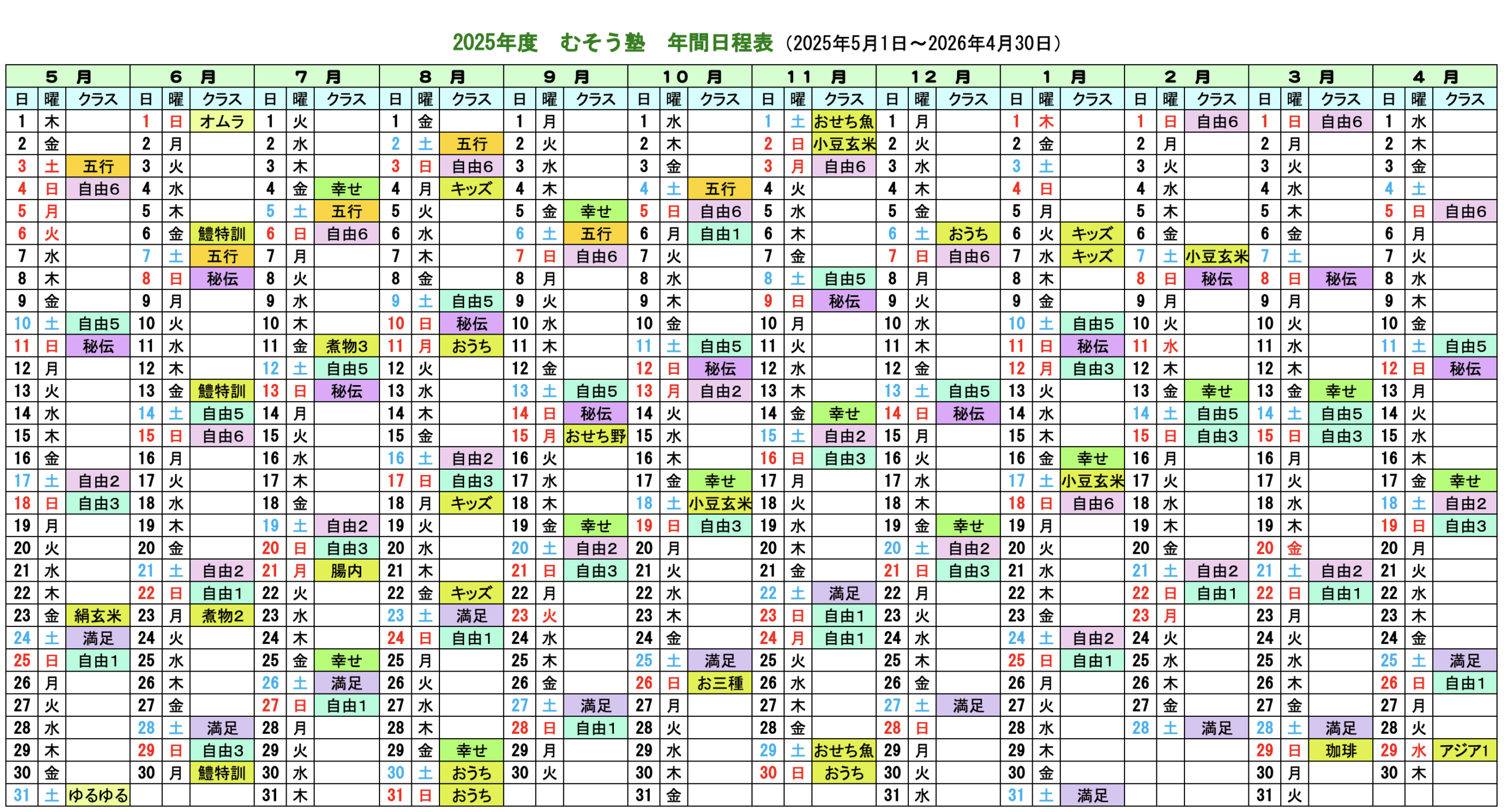 【2025年度 マクロビオティック京料理教室 むそう塾 年間日程表 2025/5〜2026/4】