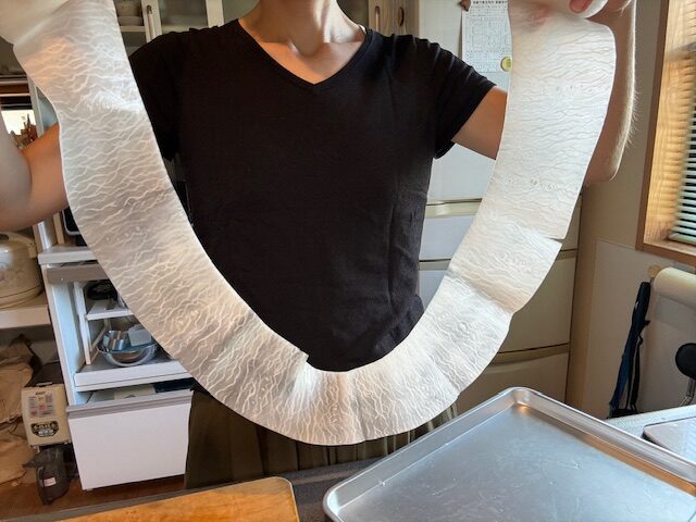 包丁の刃を上げている間中じわ〜〜〜〜っと回してください。 どんどん薄く均一になっていくのです。