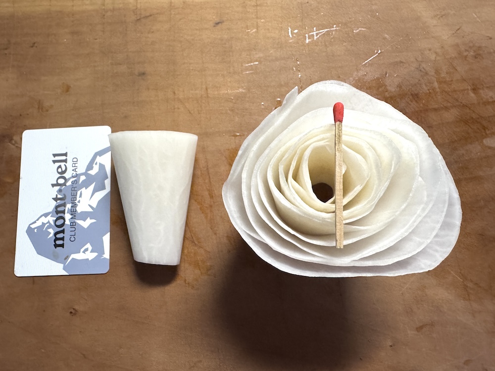 パイロンに剥きながらも刃線と大根のラインはねじれています。 これを真っ直ぐにして面圧を当てられたらこんなに苦労せずに茶筒の芯が残るでしょう。