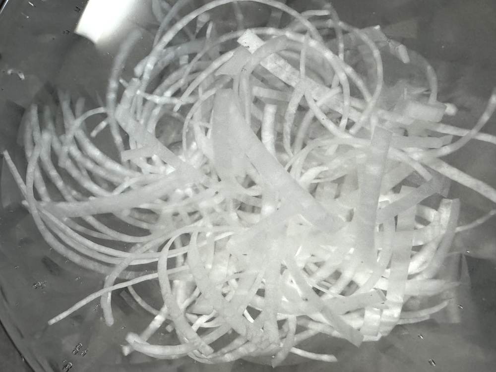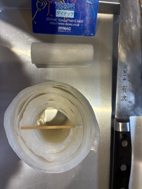 なんとかしようと握り込んでしまい包丁の刃線と大根の表面にねじれが生じてまた逆パイロンを生み出してしまいました。
