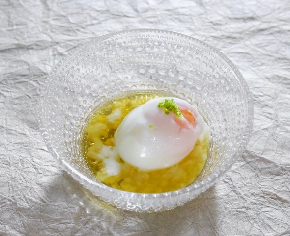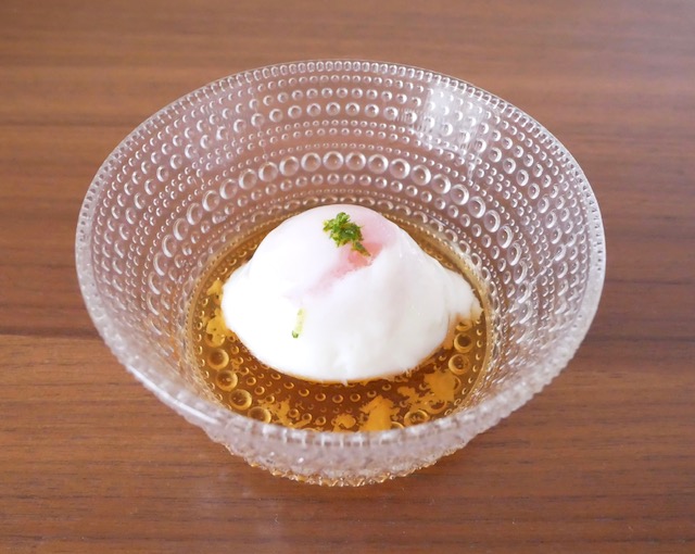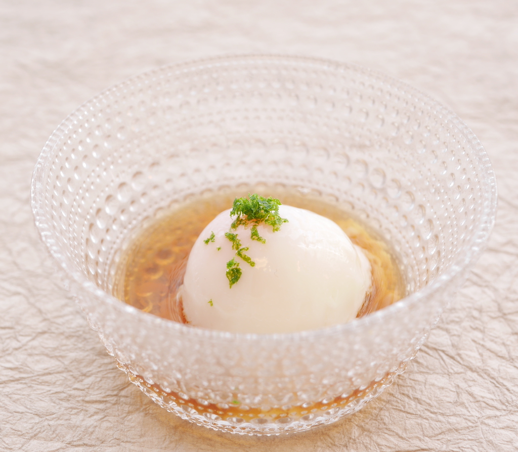 いいですねぇ 卵黄は練ウニのようにむっちりねっちりと球体に。 白身はあくまで生に近く。 理想的にできています。 出しもこれに合わせた調合です。