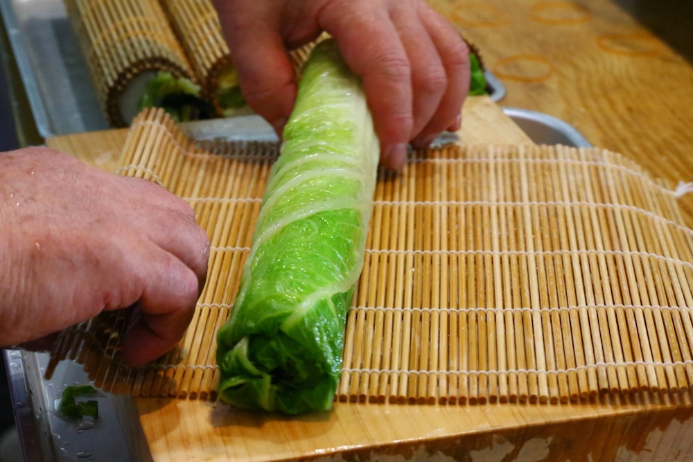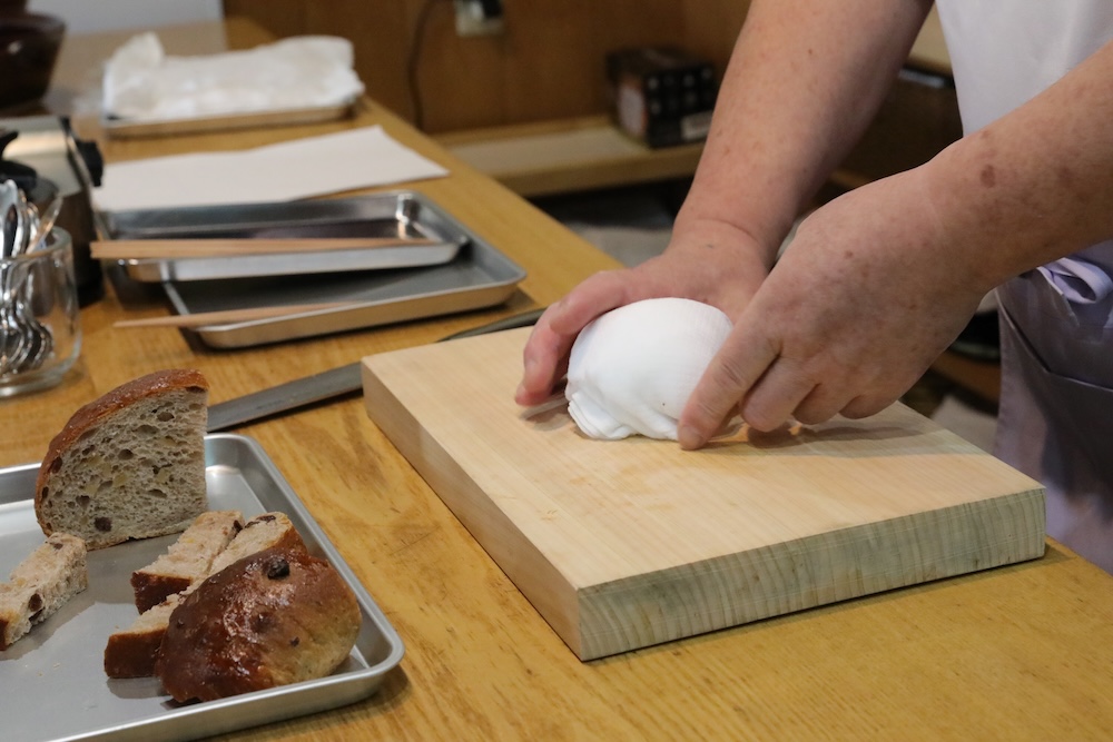 課題を見抜き、説明しています そこにあった濡れ布巾が塾長の手にかかるとあれよあれよとパン生地に変身していきます