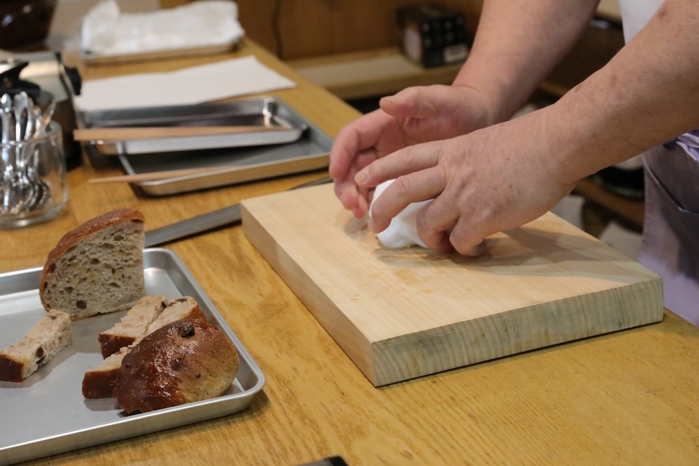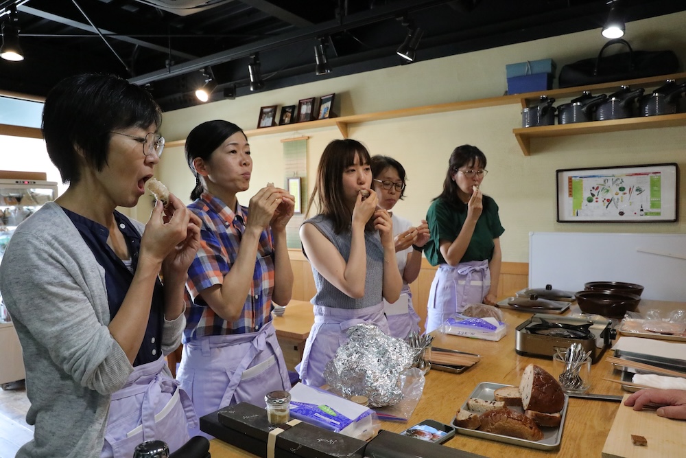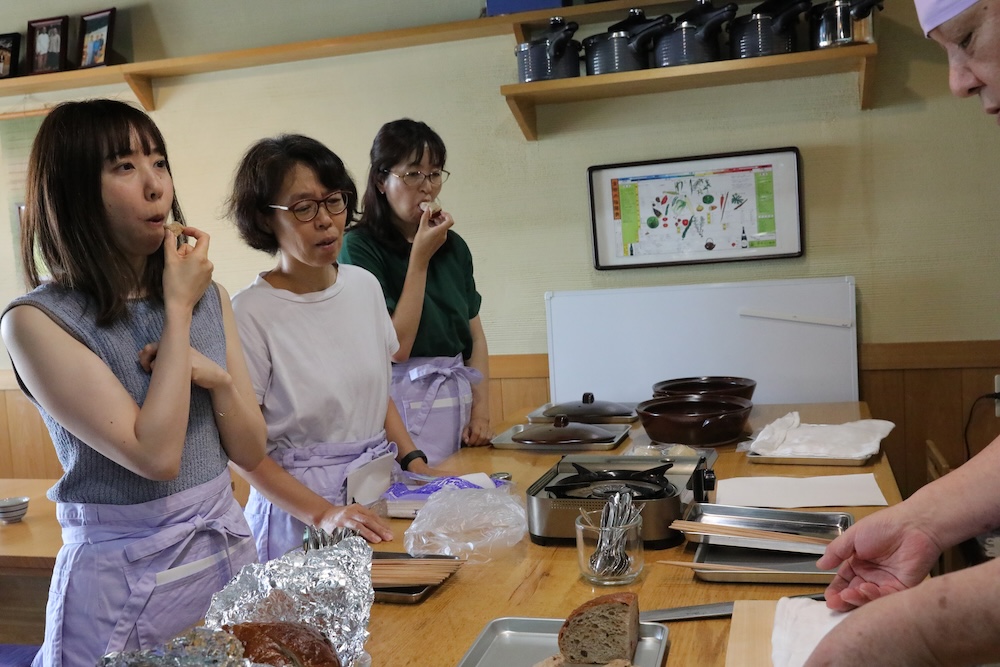 まずは放課後(前)レッスンです 糠床の健康診断 包丁砥ぎ 先月お教えしたパンの復習作品を試食したりしました