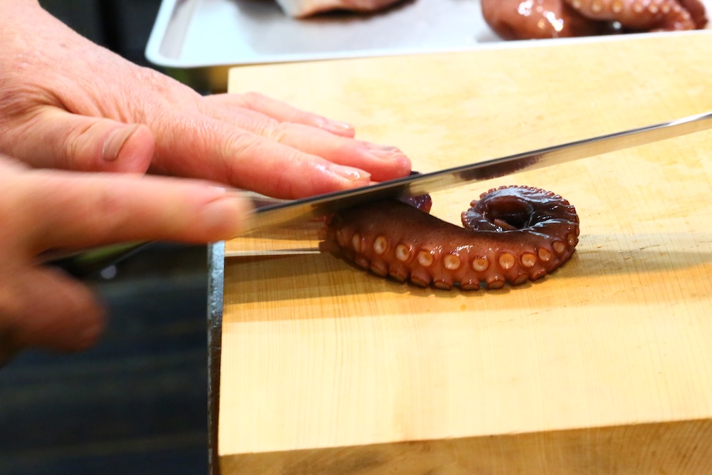 茹で蛸をへぎ切りします