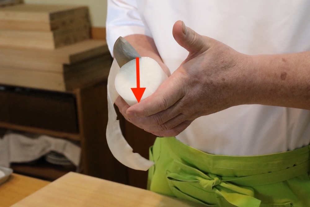 左手の親指を使わなくても桂剥きはできます それができるのは「面圧」のおかげです