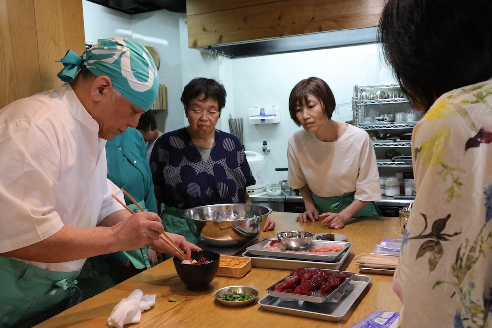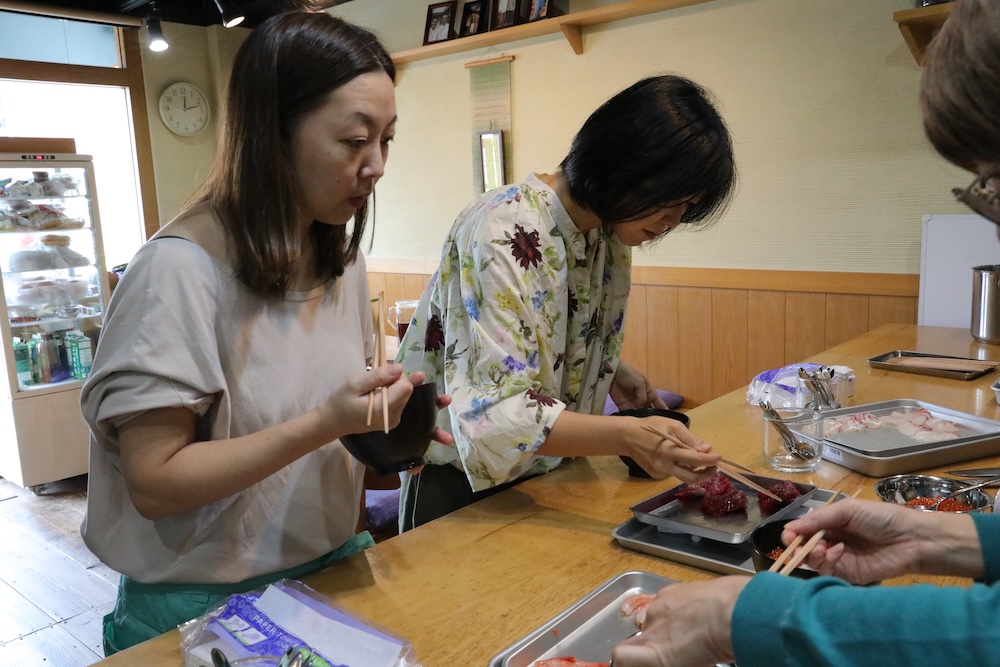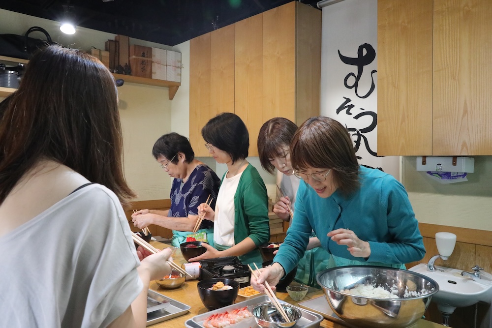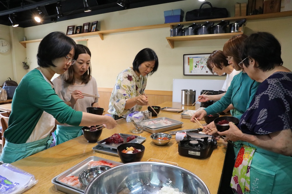 その前に軽くランチをと、塾長が海鮮丼を作りました。
