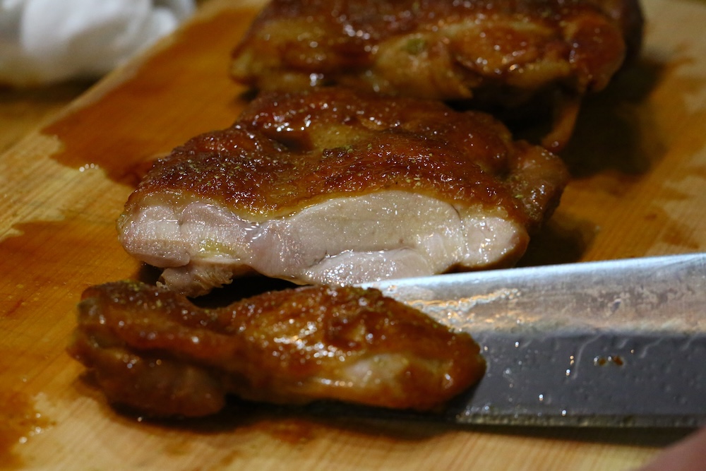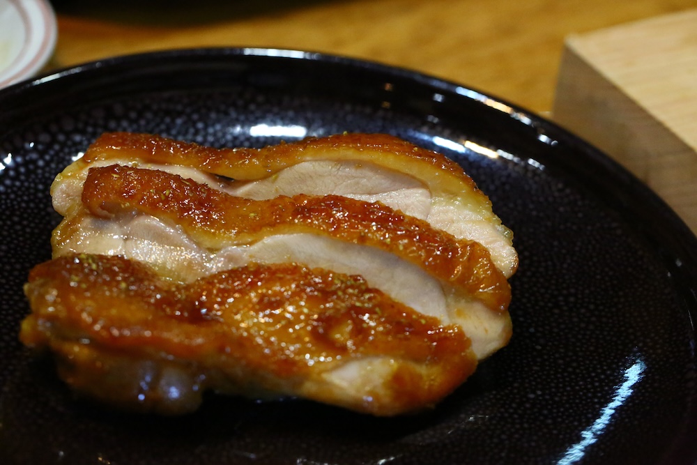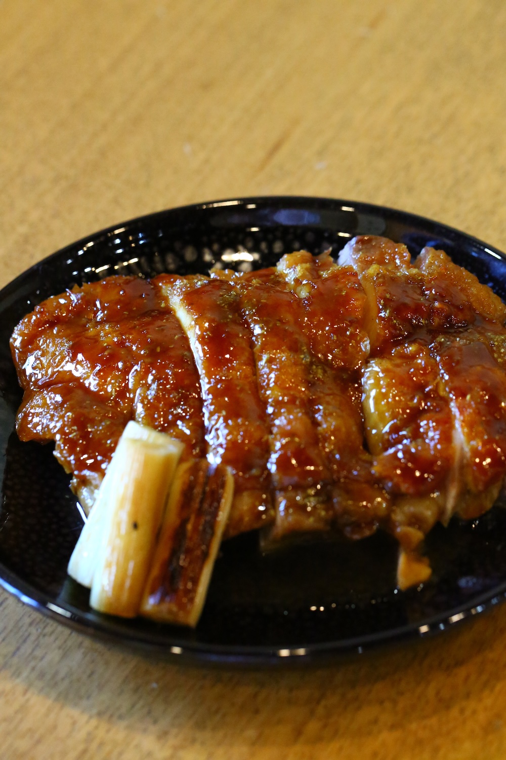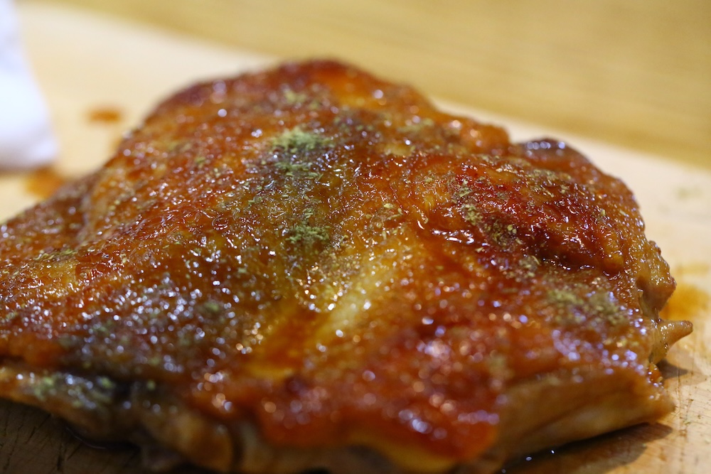 できました 地鶏の鍋照焼です 白ネギの南蛮漬を添えて