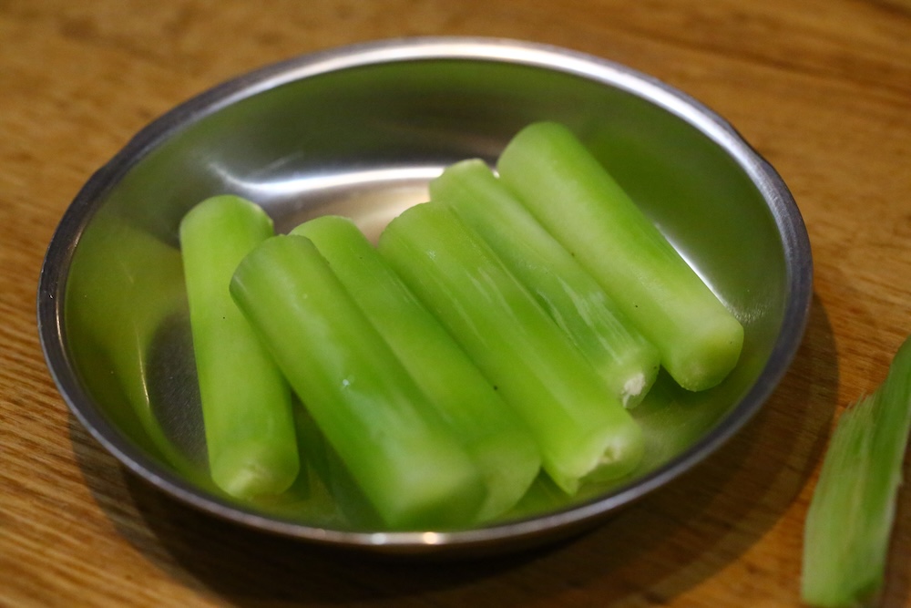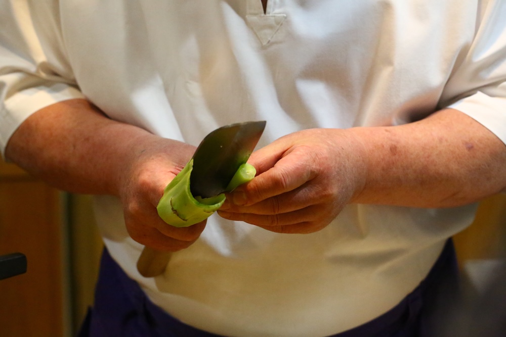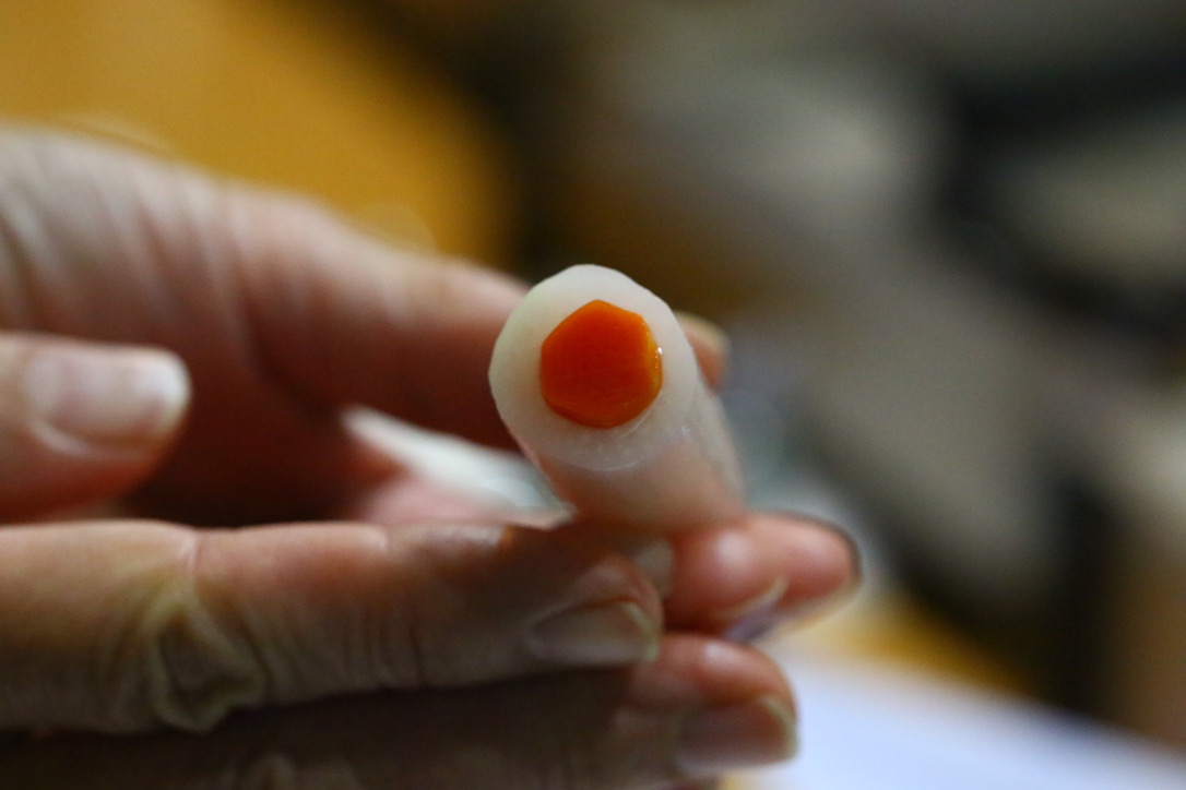 日の丸独活の芯になる人参の円筒を剥いてもらいました ちゃんとできていることに感動している塾長の顔 時間と練習は嘘をつきません