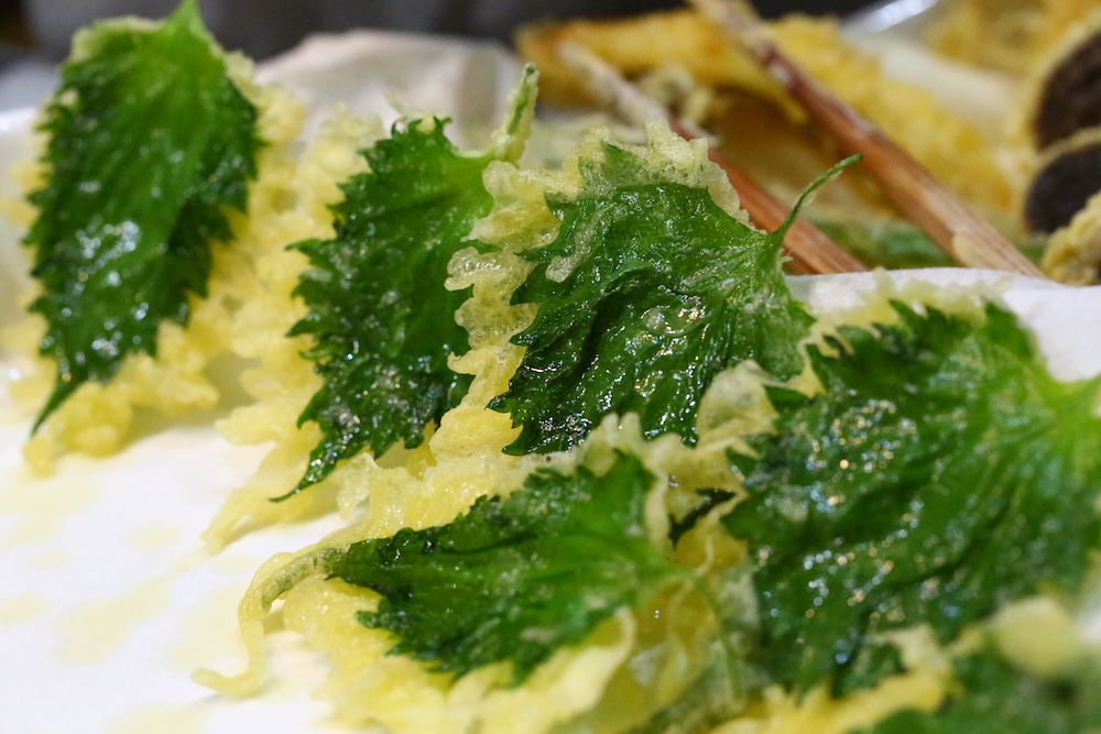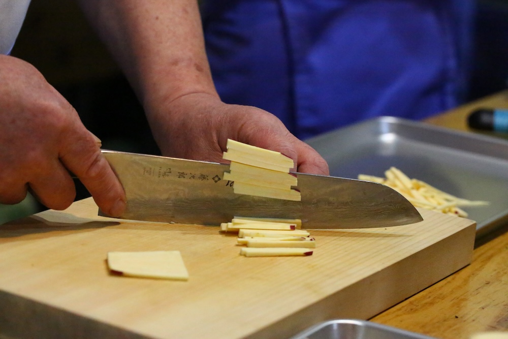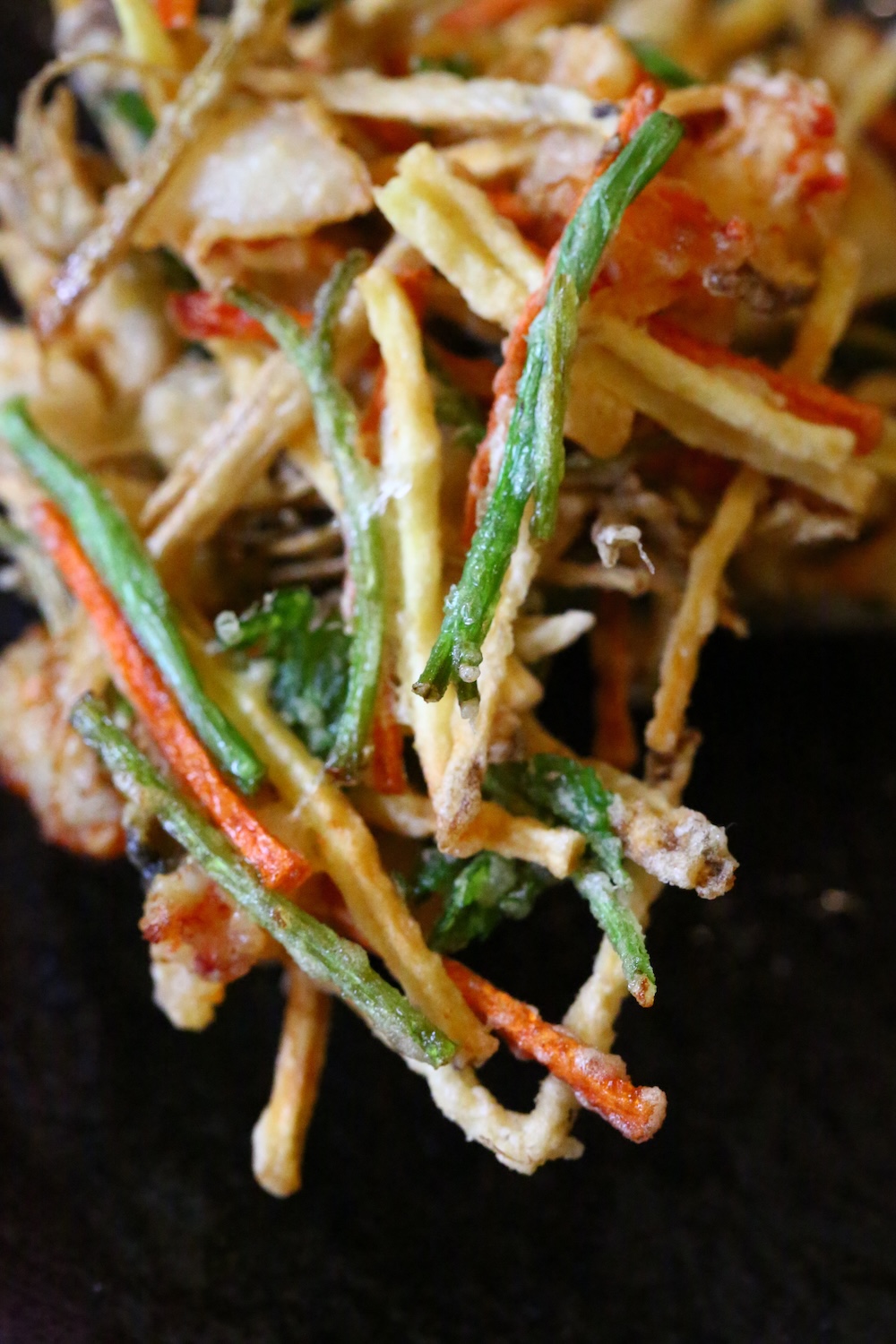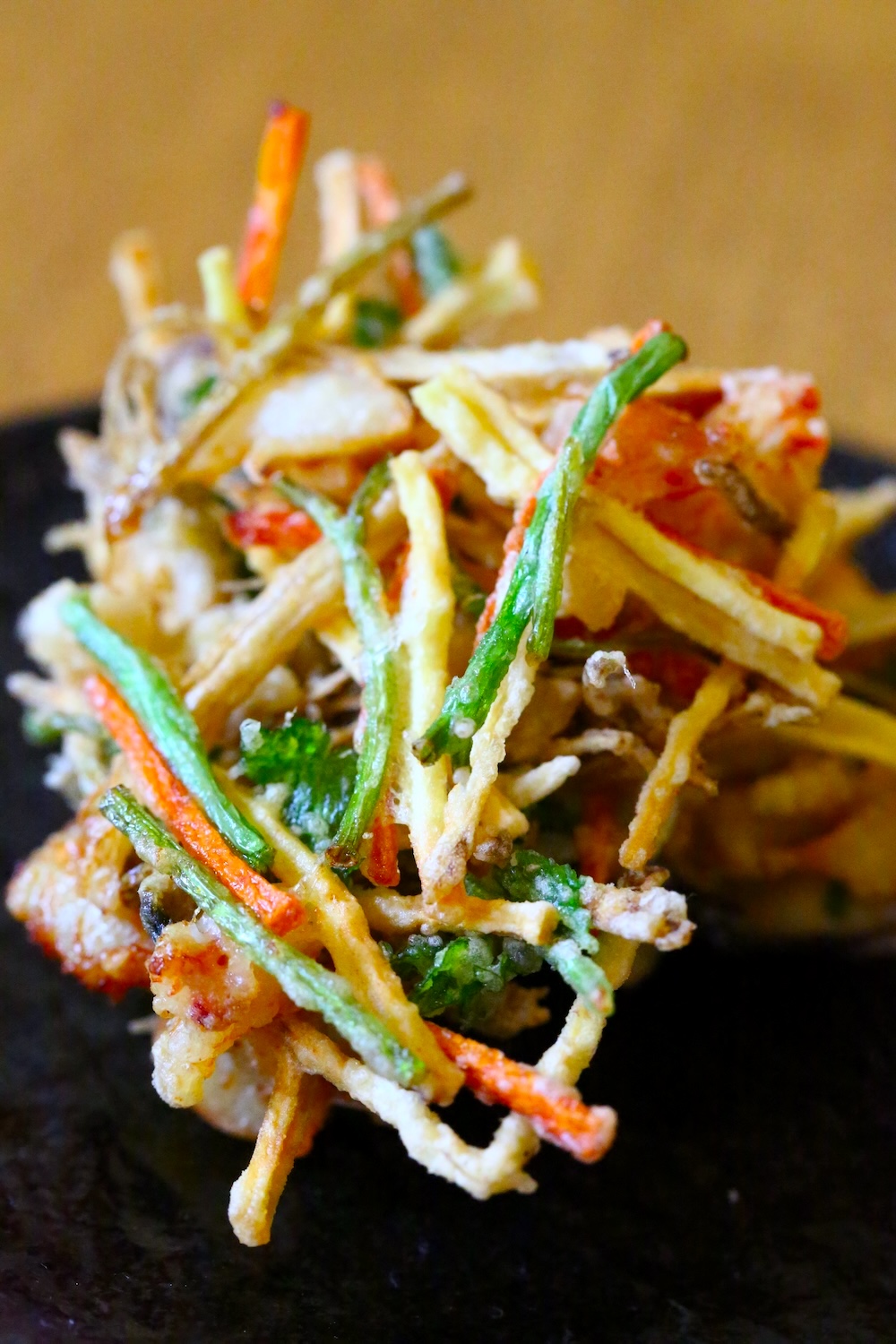 かき揚げの切り出しです テーマは火通りです 切った具のそれぞれの「水」を見れているか ここがポイントです