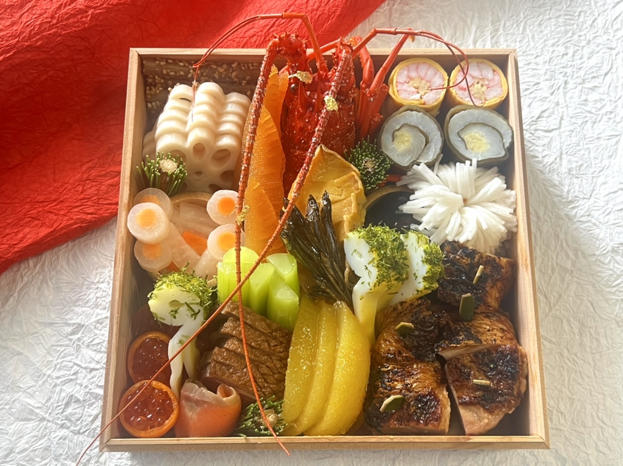 伊勢海老、数の子、蕨烏賊、ごまめ、萵苣薹青竹、鴨ロース蒸し煮、蒸鮑、