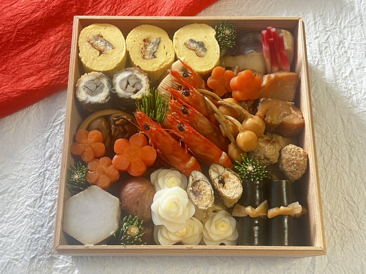 叩き牛蒡、花蓮根、日の丸独活、大根膾、黒豆、栗甘露煮、スモークサーモン、金柑いくら、
