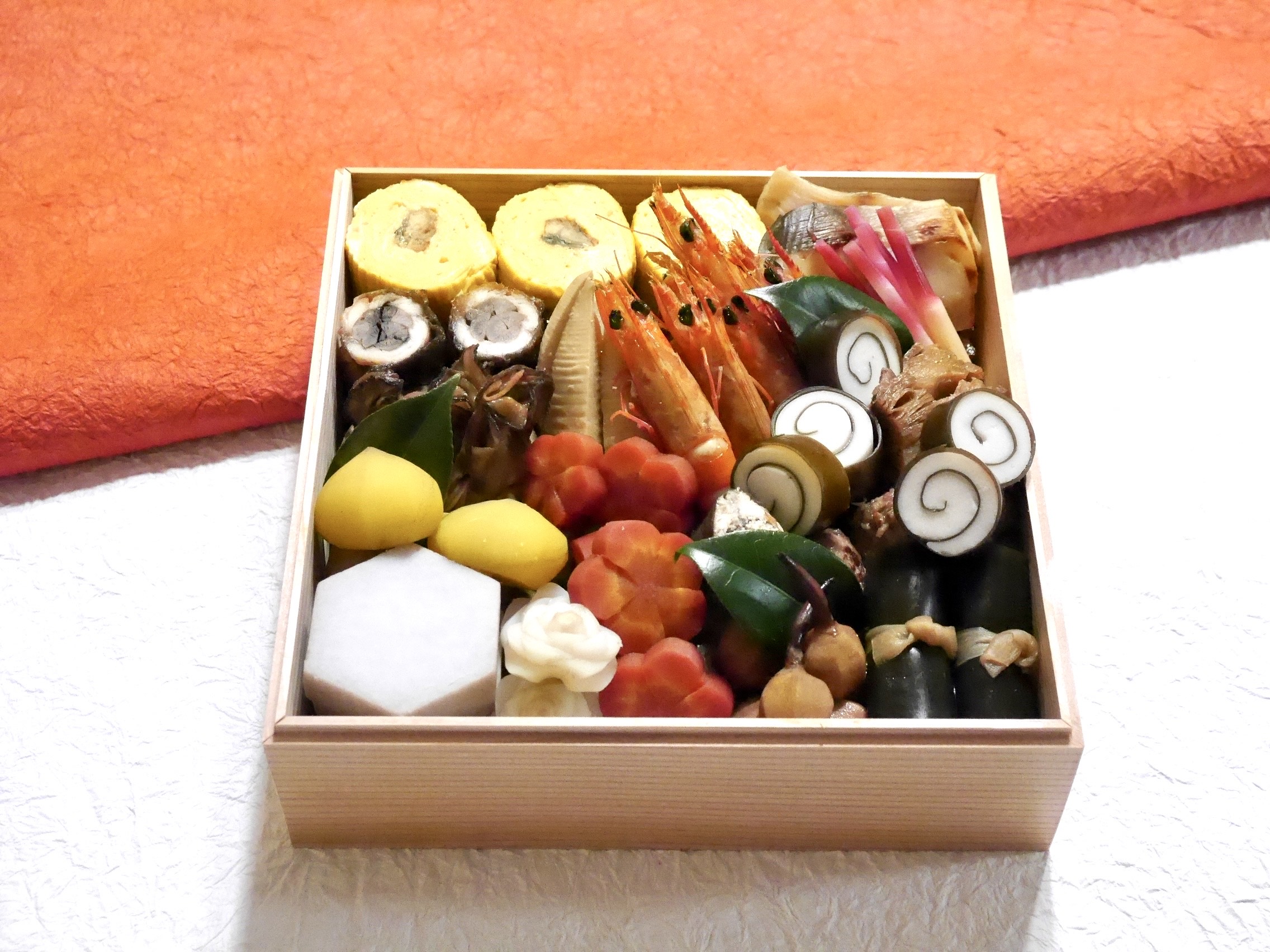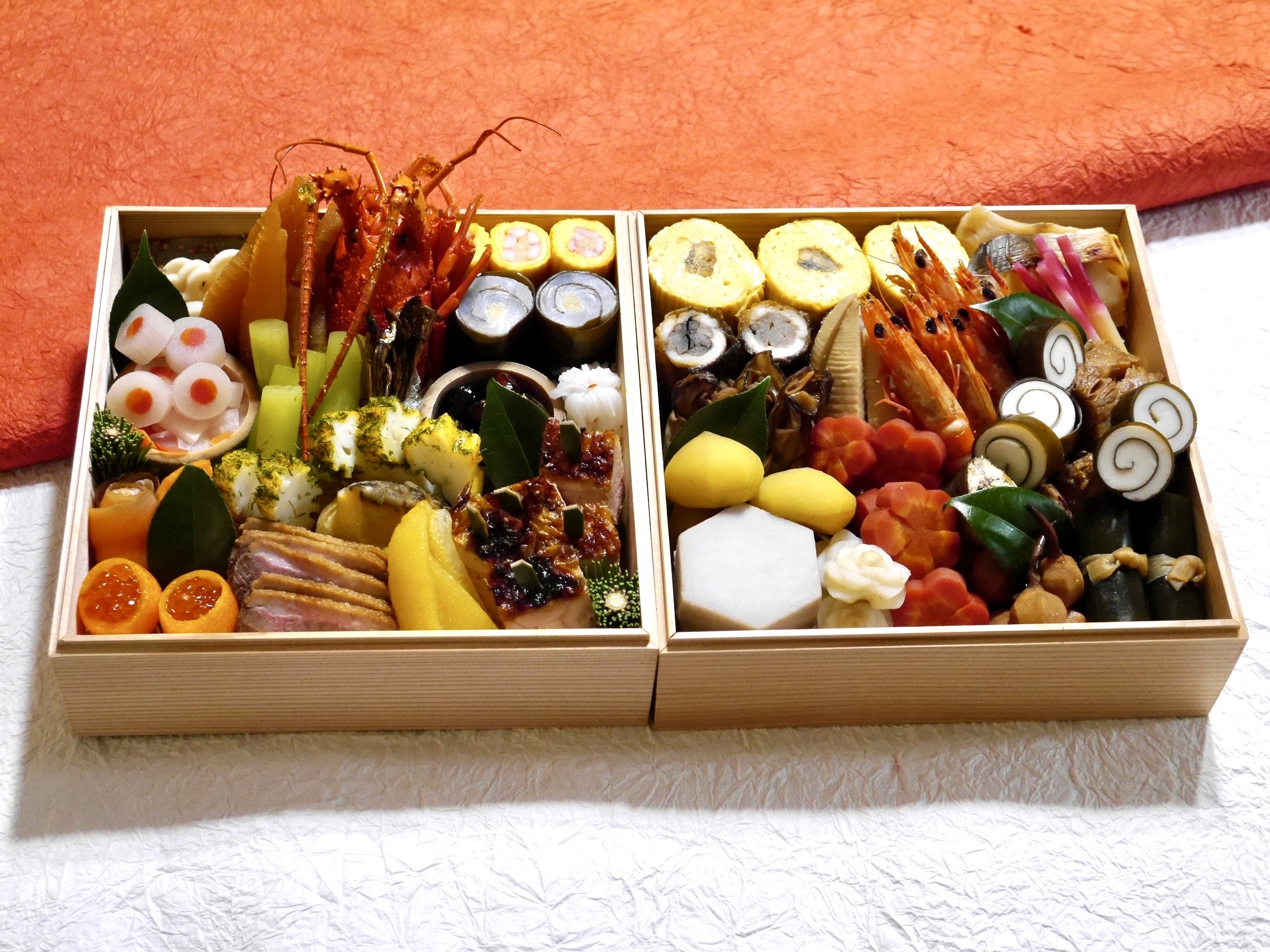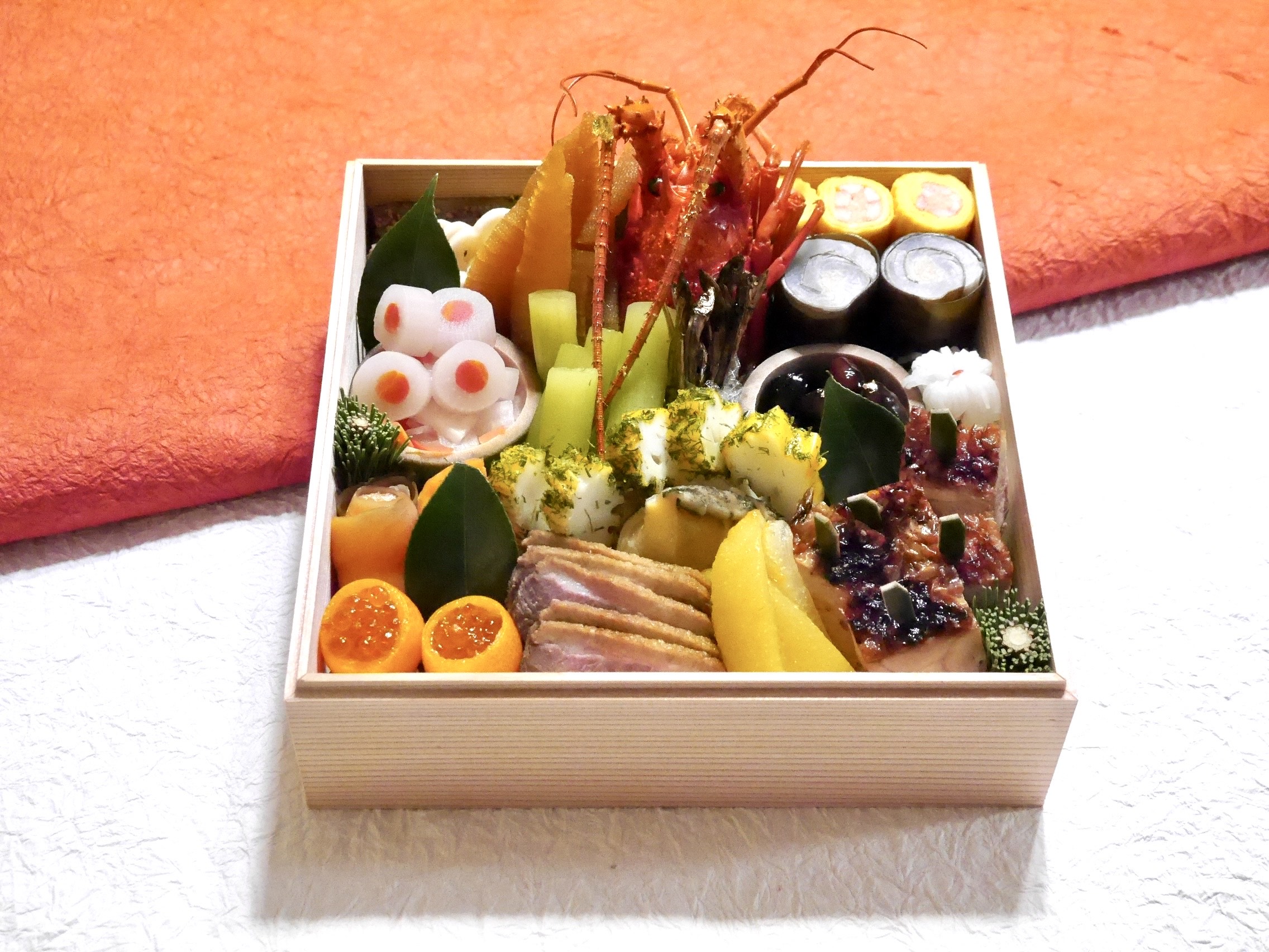伊勢海老小金焼き、蟹錦糸巻、平目求肥巻、たたき牛蒡、花蓮根、紅白膾、日の丸独活、黒豆、数の子、ごまめ、蒸し鮑、菊花蕪、地鶏付け焼、スモークサーモン、金柑いくら、鴨ロース蒸し煮、萵苣薹青竹、編笠柚子、蕨烏賊