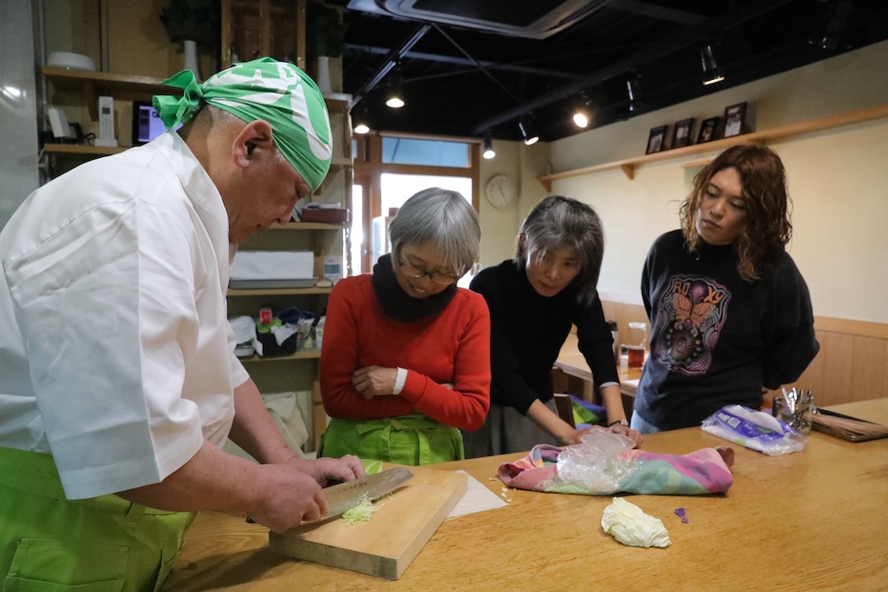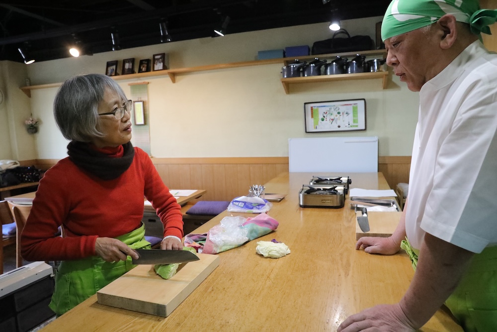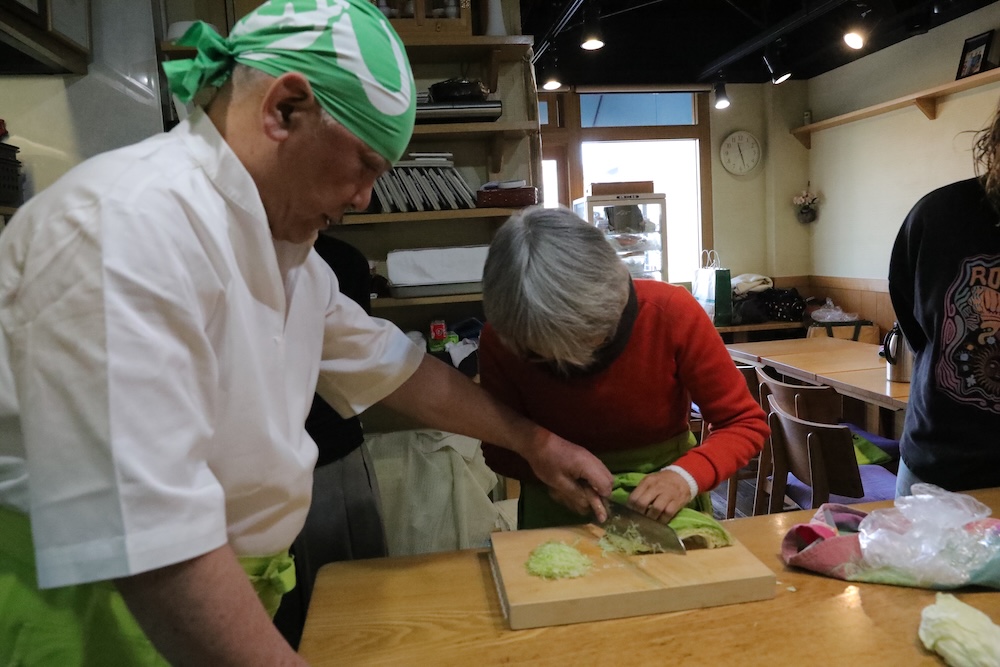 まずは放課後(前)レッスンです 先月のトンカツでお教えした糸キャベツの切り方をどうしても理解したいと包丁とキャベツを持参されました。