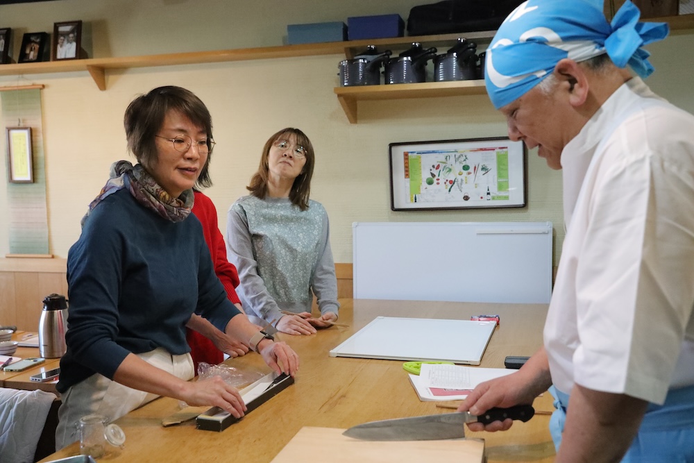 まずは放課後(前)レッスンです 糠床の健康診断 包丁砥ぎのチェックです みなさん素晴らしい状態でした