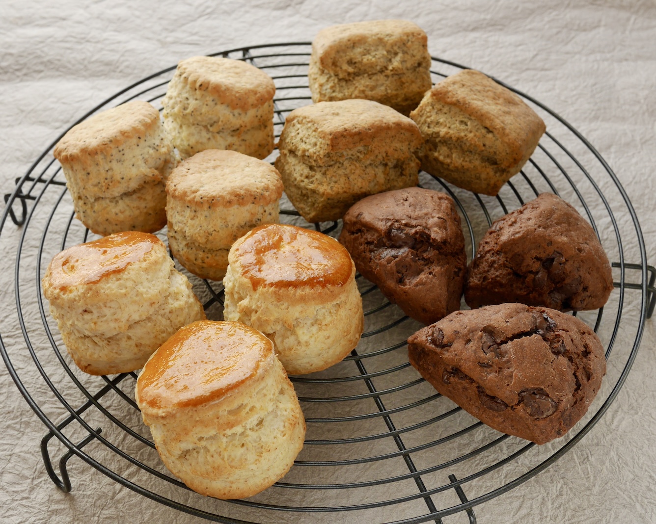 美味しく軽く焼けています よく上がっていますね 口溶けの良さと軽さが自慢のスコーンです あなたが使うと円形のケーキクーラーもおしゃれに見えますねぇ 合格です