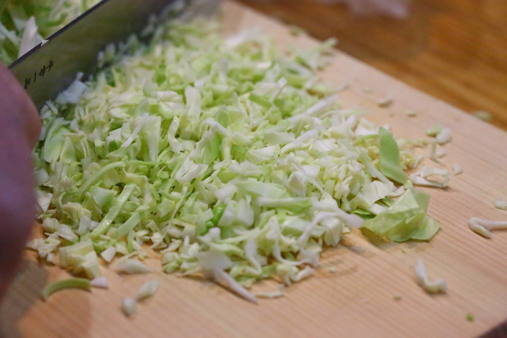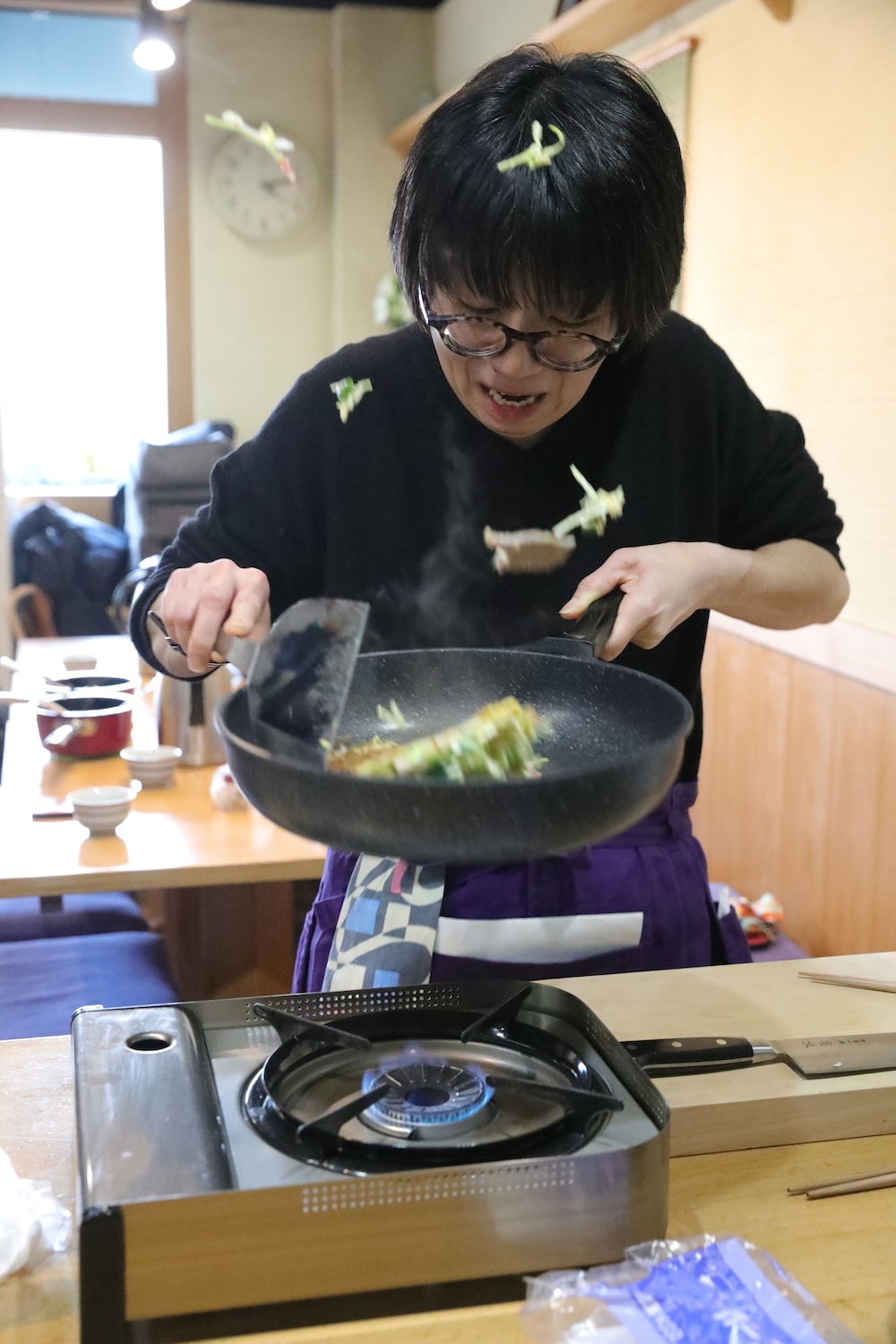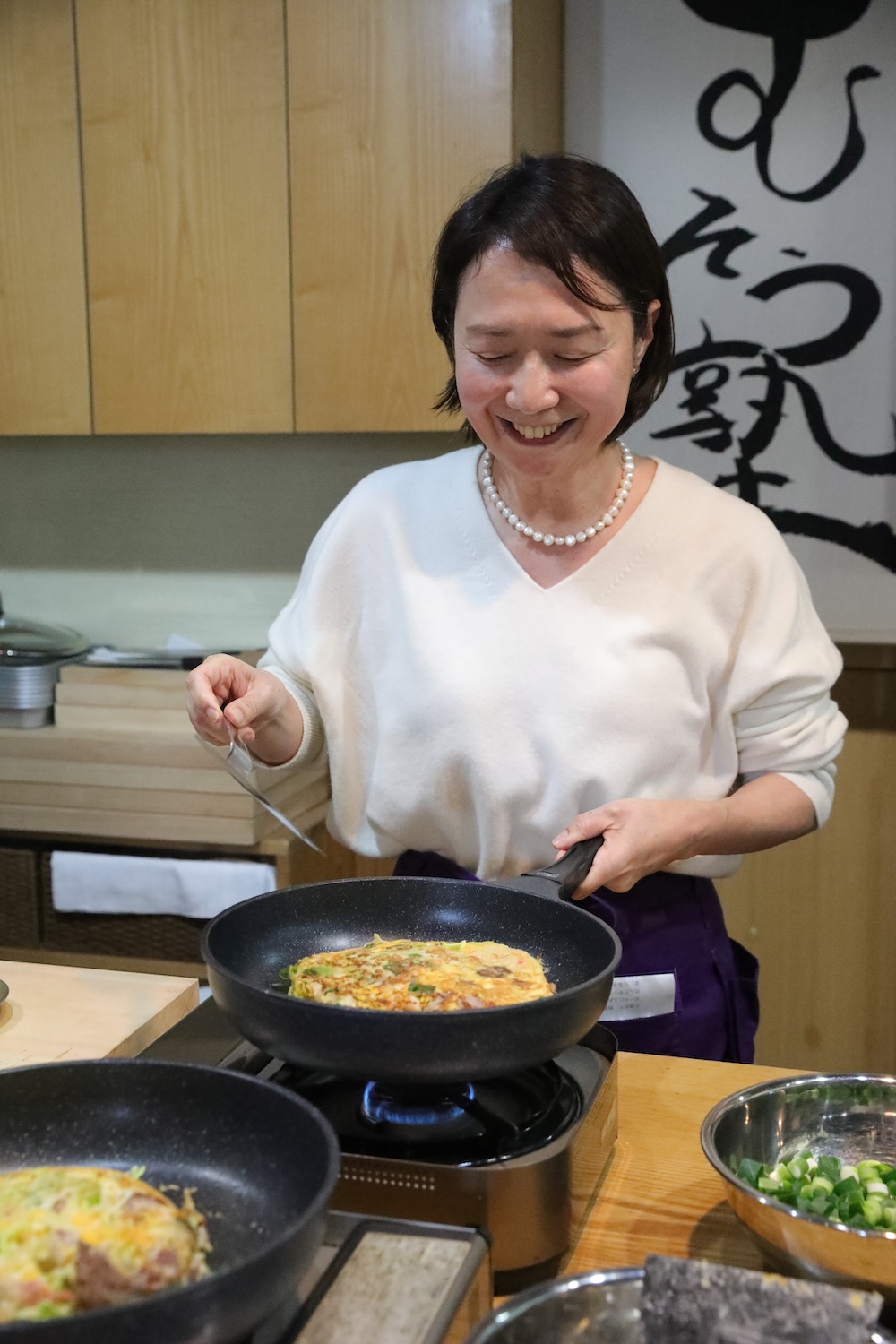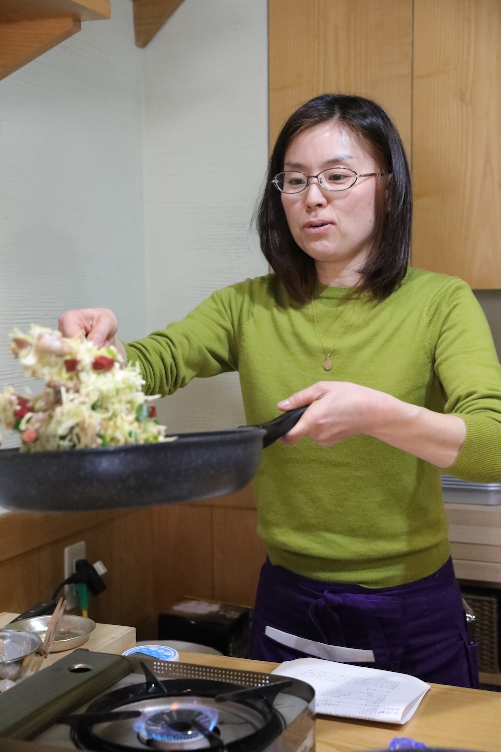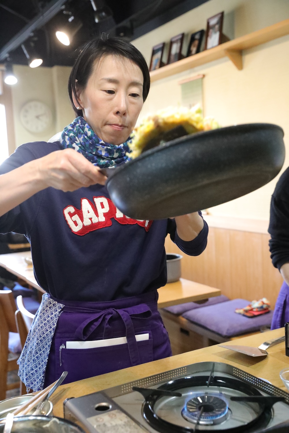 返しの練習をしてふわふわで形よくお好み焼きを作ります。焼きそばは中川さんの仕上がりを目指して復習します。