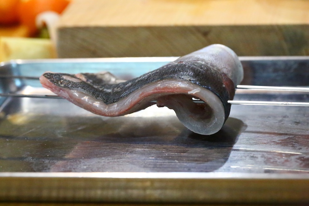 おろした片方を塩焼き用に串打ちします