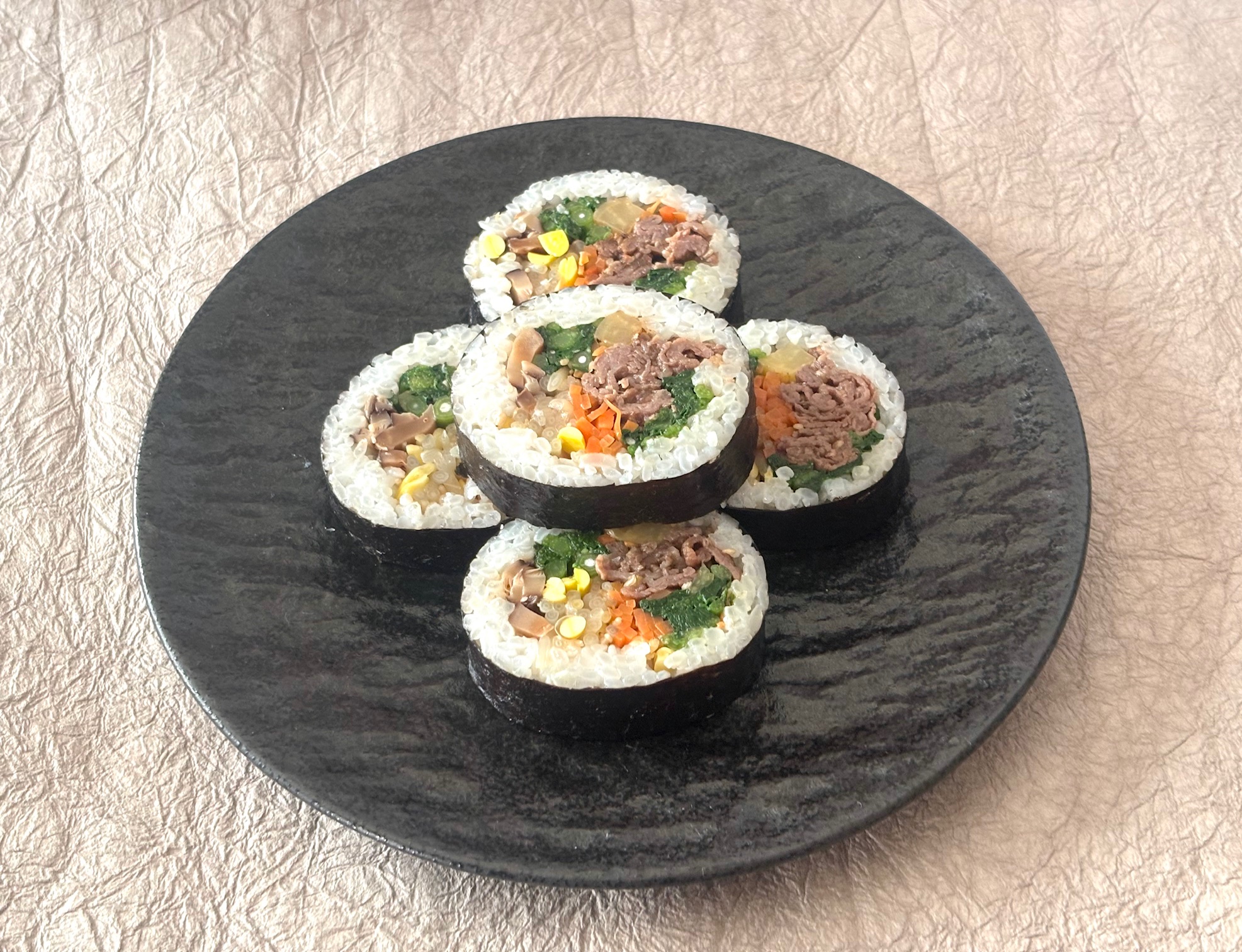 美味しく巻けています プルコギもたっぷりはいって男子も大満足なキンパになりました。 ほんの少しパワーをかけすぎているので注意しましょう 慣れていけば力加減がわかってくるでしょう 合格です