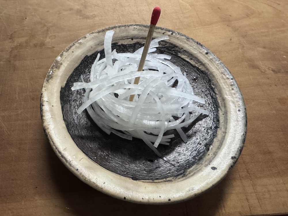 なんとかしようと握り込んでしまい包丁の刃線と大根の表面にねじれが生じてまた逆パイロンを生み出してしまいました。