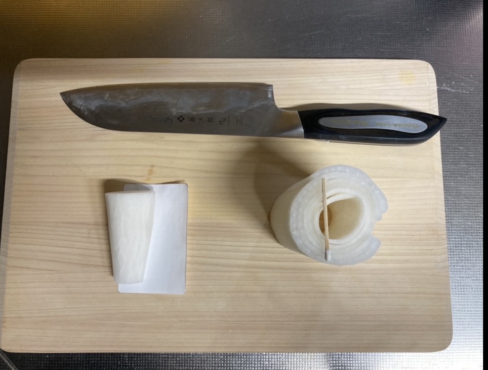 マッチ棒の厚さに剥いてマッチ棒の幅に刻む になっていますね 反対側はマッチ棒よりも分厚いと思います