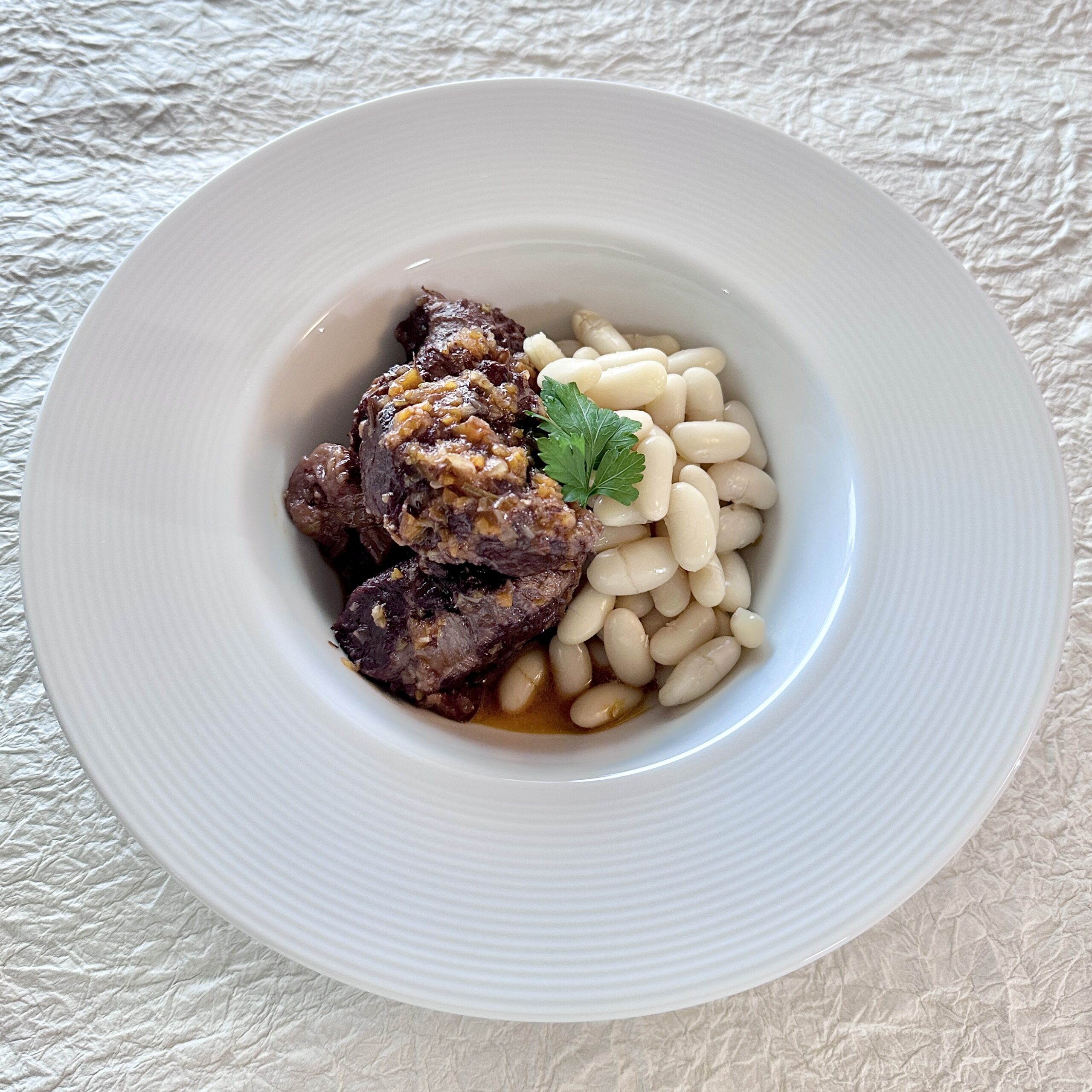 美味しくできましたね フォークで触れるとほろりと崩れる赤身の肉の美味しさが伝わってきます カンネリーニも煮崩れずに柔らかく炊けています 合格です
