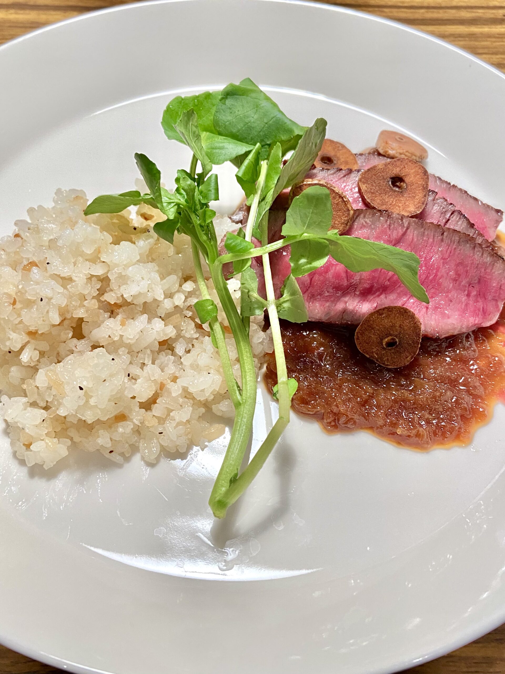 おいしく焼けています ちょうどよい火通り加減です 分厚い肉を焼いたときの理想ですね。 にんにくの焦げは御愛嬌で もう少し弱く長く揚げましょう 合格です